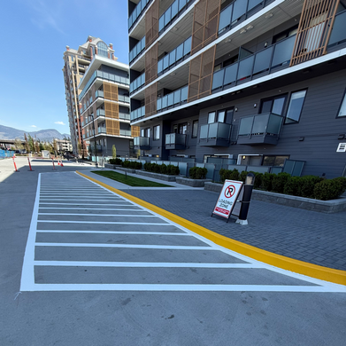 Our line marking service helps to ensure clear and visible parking spaces on your lot, while also creating efficient traffic flow and an optimal use of your lots space. We only use the highest quality material ensuring both long-lasting and great looking lines. Whether you need new stalls and stencils on fresh asphalt or a new parkade, or a simple respray, we have you covered.